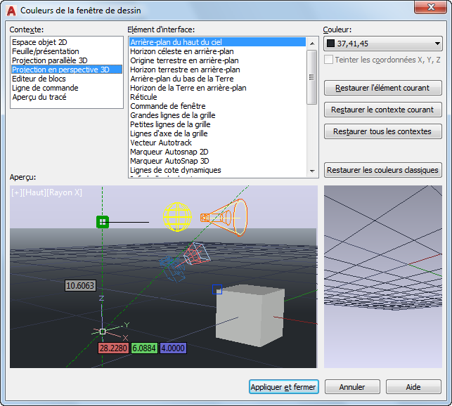 Rétablit les paramètres de couleur classiques d'AutoCAD 2008 pour les éléments d'interface de l'espace objet 2D uniquement.