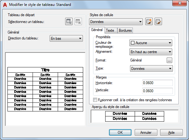 Vous permet de spécifier un tableau dans votre dessin qui sera utilisé comme exemple pour le formatage de ce style de tableau. Une fois que vous avez sélectionné un tableau, vous pouvez spécifier la structure et le contenu à copier de ce tableau vers le style de tableau.