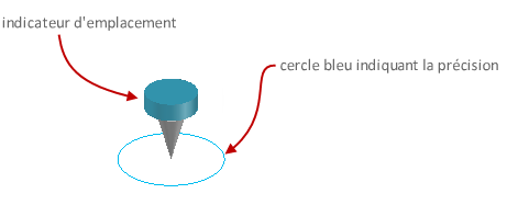 Le système affiche l'indicateur Mon emplacement dans l'espace objet à l'emplacement correspondant à votre emplacement actuel. Si vous vous déplacez, cet indicateur fait de même. Si votre position ne peut pas être déterminée avec précision, un cercle bleu s'affiche autour de cet indicateur. Plus le cercle est petit, plus la précision est élevée.