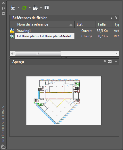 Dans la palette Références externes, vous pouvez afficher les informations relatives au calque sous-jacent sous forme d'une liste ou d'une arborescence. Pour déterminer le mode d'affichage des informations dans la palette Références externes, cliquez sur le bouton Affichage sous forme de liste ou Affichage sous la forme d'une arborescence, dans le coin supérieur droit du gestionnaire. La liste présente le nom de chaque calque sous-jacent du dessin, accompagné de son état de chargement, de sa taille, de la date de sa dernière modification et de son chemin d'accès. L'arborescence, quant à elle, fournit un affichage hiérarchique des calques sous-jacents qui montre leur niveau d'imbrication au sein des références externes et des blocs. Elle n'indique pas l'état, la taille ni aucune autre information sur les images.