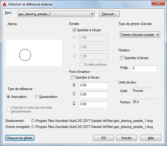 Sélectionnez le chemin d'accès complet (absolu), le chemin d'accès relatif ou aucun chemin d'accès à la référence externe mais le nom de la référence externe (le fichier doit figurer dans le dossier contenant le fichier de dessin courant).