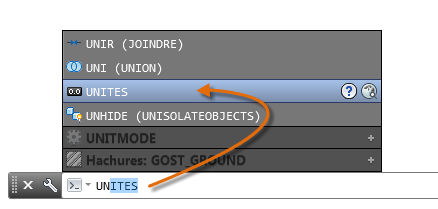Notez que lorsque vous commencez à saisir une commande, elle est complétée automatiquement. Lorsqu'il existe plusieurs possibilités, comme dans l'exemple ci-dessous, vous pouvez effectuer votre choix en cliquant dessus ou à l'aide des touches fléchées, puis appuyer sur la touche Entrée ou sur la barre d'espace.