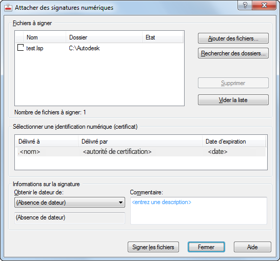 Joint une signature numérique à tous les fichiers répertoriés dans la boîte de dialogue.
