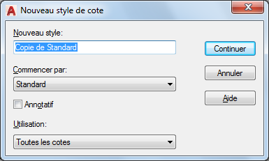 Permet de nommer le nouveau style de cote, de choisir le style à partir duquel en créer un autre et d'indiquer les nouveaux types de cote auxquels vous désirez appliquer le nouveau style.
