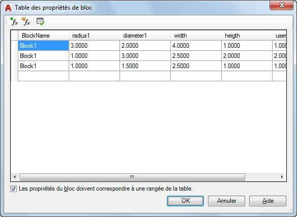 Dans la boîte de dialogue Table des propriétés de bloc, les en-têtes de colonne sont des paramètres et les lignes définissent les valeurs du jeu de propriétés. Une référence de bloc sélectionnée peut être définie sur les valeurs définies. Chaque définition de bloc peut posséder une table.