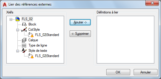 Déplace les définitions d'objet nommé sélectionnées dans la liste des xréfs vers la liste Définitions à lier.