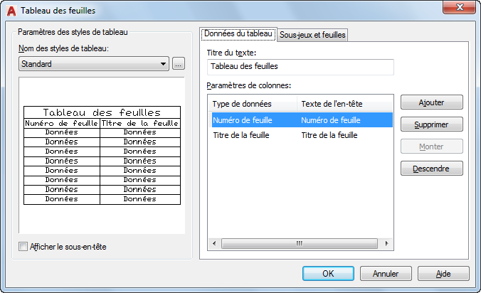 Cette table peut être ajoutée à une feuille dans le jeu de feuilles courant mais est en principe ajoutée à la feuille de titre.