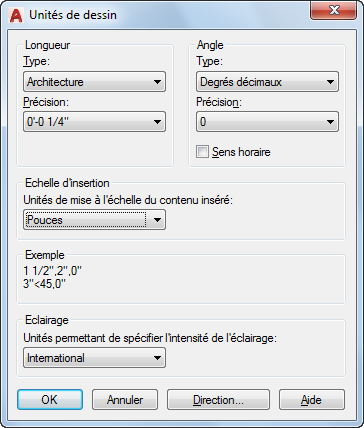 Les valeurs possibles sont Architecture, Décimal, Ingénierie, Fractionnaire et Scientifique. Les formats Ingénierie et Architecture génèrent des affichages en pieds et en pouces et supposent que chaque unité de dessin représente un pouce. Les autres formats peuvent représenter une unité réelle quelconque.