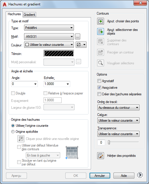 La boîte de dialogue Hachures et gradient comporte deux onglets et des options communes qui sont disponibles dans les deux onglets.