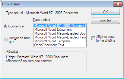 Affiche la liste des types d'objets disponibles. Si vous choisissez l'option Entités AutoCAD, le texte est converti en objet texte multiligne (textmult), une feuille de calcul est convertie en objet tableau et un fichier bitmap est converti en objet image.