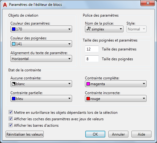 Modifie la couleur, le texte, les poignées, les contraintes, ainsi que d'autres paramètres d'affichage de l'éditeur de blocs.