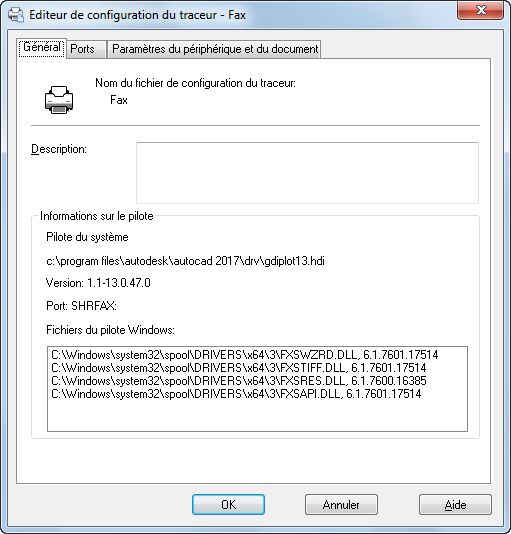 - Nom de l'imprimante système (si le traceur configuré correspond à l'imprimante système)