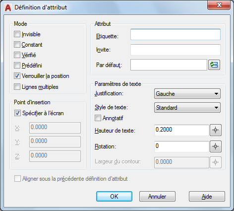 Affecte aux attributs une valeur fixe pour l'attribut lorsque vous insérez le bloc. Ce paramètre est utilisé pour les informations qui ne changent jamais.