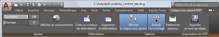 Lorsque vous sélectionnez un calque sous-jacent PDF, l'onglet contextuel PDF s'affiche sur le ruban.