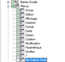 - Dans le volet Personnalisations dans <nom de fichier>, cliquez sur le signe Plus (+) en regard du noeud Menus pour le développer.