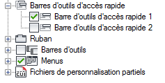 - Dans le volet Personnalisations dans <nom de fichier>, cliquez sur le signe Plus (+) en regard du noeud Barres d'outils d'accès rapide pour le développer.