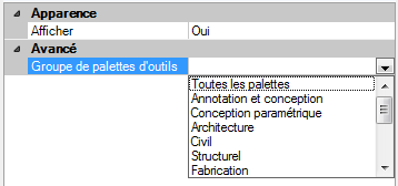 - Dans la zone Groupe de palettes d'outils, sélectionnez l'un des groupes de palettes d'outils répertoriés pour l'associer à l'onglet de ruban.