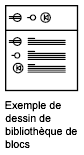 Vous pouvez organiser un jeu de définitions de bloc apparentées en créant les blocs dans le même fichier dessin. Les fichiers dessin utilisés de cette façon se nomment bibliothèques de blocs ou de symboles. Ces définitions de bloc peuvent être insérées séparément dans un dessin. Les dessins de bibliothèque de blocs ne diffèrent pas des autres fichiers dessin, sauf dans leur utilisation.