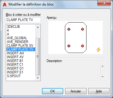 Affiche la liste des définitions de bloc enregistrées dans le dessin courant. Lorsque vous sélectionnez une définition de bloc dans la liste, son nom s'affiche dans le champ Nom.