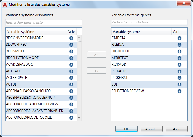 Répertorie toutes les variables système disponibles pouvant être contrôlées. Entrez une chaîne dans la zone de recherche pour rechercher rapidement une variable système.