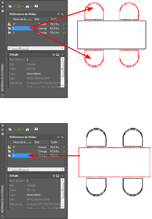 Un fichier de dessin peut être attaché comme xréf à plusieurs dessins en même temps. Inversement, plusieurs dessins peuvent être attachés comme dessins référencés à un même dessin.