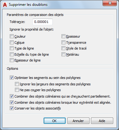 Supprime la géométrie en double ainsi que les lignes, arcs et polylignes qui se chevauchent. Combine également les lignes, arcs et polylignes se chevauchant ou contigus.