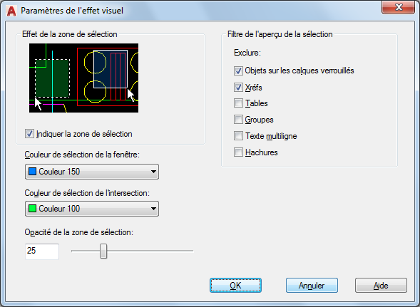 - Exclut les objets des calques verrouillés dans l'aperçu de la sélection. Elle est activée par défaut (variable système PREVIEWFILTER).