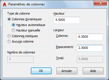 Affiche et spécifie les valeurs de largeur des colonnes de contrôle et de l'espacement. La valeur de l'espacement correspond à cinq fois la hauteur de texte par défaut.