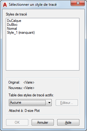 Affiche les styles de tracé disponibles, y compris le style par défaut NORMAL. Un style de tracé est un ensemble de paramètres de propriété utilisés au cours du tracé.