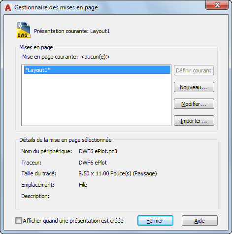 Vous pouvez également créer des mises en page nommées, modifier des mises en page existantes, ou importer des mises en page à partir d'autres dessins.