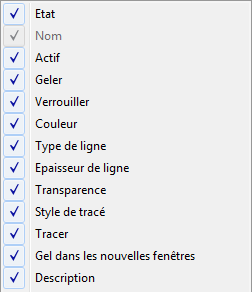 Répertorie toutes les colonnes par leur nom. Une coche indique que la colonne est incluse dans l'affichage. Cliquez sur le nom d'une colonne pour l'afficher ou la masquer. Les paramètres Gel de la fenêtre, Couleur de fenêtre, Type de ligne de fenêtre, Epaisseur de ligne de fenêtre et Style de tracé de fenêtre sont disponibles uniquement lorsqu'une fenêtre de présentation est active.