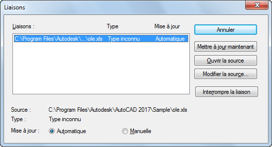 Supprime la liaison entre l'objet et le fichier d'origine. L'objet de votre dessin est modifié au format WMF (Windows metafile format) et ne sera pas affecté par des modifications ultérieures apportées au fichier d'origine.