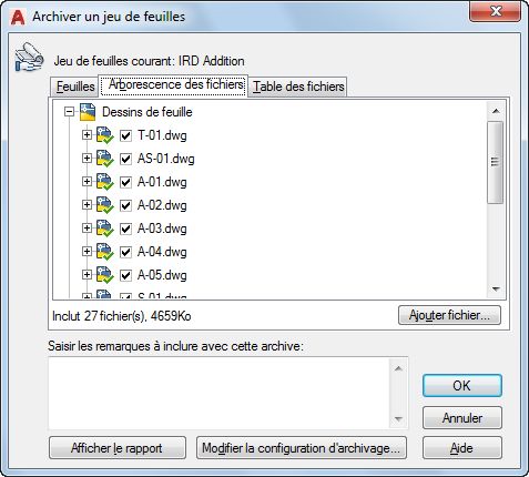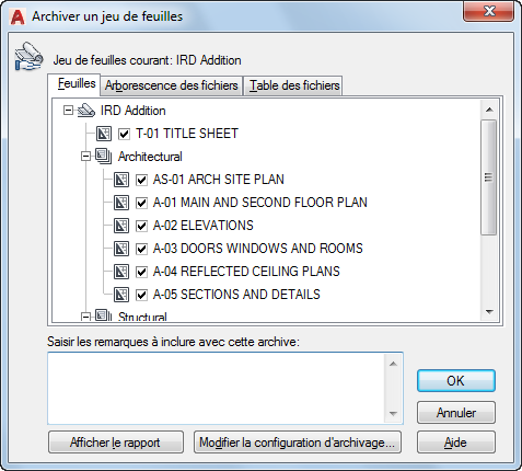 Répertorie les feuilles à inclure dans le module d'archive dans l'ordre des feuilles et conformément à l'organisation du sous-jeu. Un jeu de feuilles doit être ouvert dans le gestionnaire du jeu de feuilles. Vous pouvez sélectionner la commande Archiver dans le menu contextuel qui s'affiche lorsque vous cliquez avec le bouton droit de la souris sur le noeud du jeu de feuilles de premier niveau. Vous pouvez également entrer ARCHIVER sur la ligne de commande.
