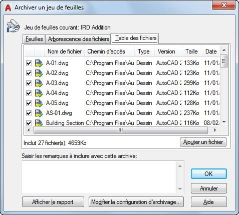 Répertorie les fichiers à inclure dans le module d'archive dans un format de table. Par défaut, tous les fichiers associés au dessin courant (tels que les fichiers externes, les styles de tracé et les polices) sont listés. Vous pouvez ajouter des fichiers au module d'archive ou supprimer des fichiers existants. Les fichiers associés qui sont référencés par des URL ne sont pas inclus dans le module d'archive.