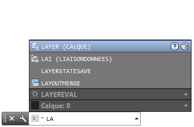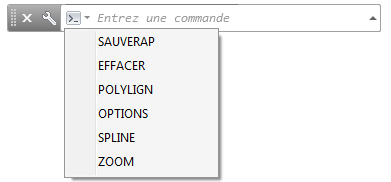 Par défaut, le nom d'une commande ou d'une variable système est automatiquement complétées lors de la saisie. Une liste de suggestions répertoriant les commandes et variables système qui utilisent les mêmes lettres s'affiche également. Vous pouvez définir les paramètres de ces fonctions dans la boîte de dialogue Options de recherche de saisie.