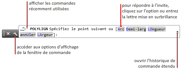 La fenêtre de commande ancrable et redimensionnable accepte les commandes et les variables système. En outre, elle affiche des invites qui vous aident à réaliser une séquence de commandes complète (y compris les commandes qui ont été lancées depuis un autre emplacement, tel qu'un ruban).