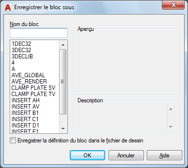 Enregistre la définition de bloc en tant que fichier de dessin. Si vous sélectionnez un fichier de dessin existant, le fichier enregistré est remplacé. Par défaut, le nom de bloc spécifié est considéré comme le nom du fichier de dessin.
