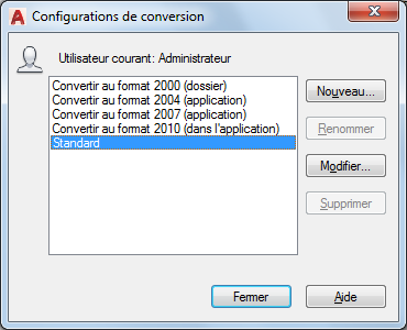 Affiche la boîte de dialogue Modifier la configuration de la conversion, qui vous permet de spécifier des options pour la conversion des dessins sélectionnés.