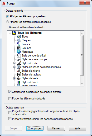 Supprime tous les objets nommés inutilisés présents dans le dessin, même s'ils sont contenus dans (ou référencés par) d'autres objets nommés inutilisés.