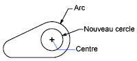 L'exemple suivant utilise la fonction rad avec la commande CERCLE. Le rayon du nouveau cercle correspond à deux tiers du rayon du segment de l'arc de la polyligne sélectionnée :