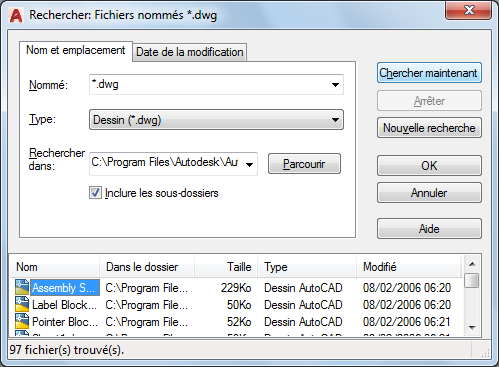 Le type de fichiers à inclure dans la recherche est déterminé par Type. Il est ainsi inutile d'entrer une extension de fichier dans Nommé. Par exemple, pour rechercher house102.dwg, entrez house* et choisissez le type de fichier Dessin (*.dwg).