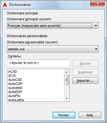 Affiche le nom du dictionnaire personnalisé courant. L'extension .cus est utilisée pour le dictionnaire personnalisé d'AutoCAD.