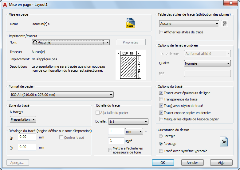 Un format de papier par défaut est défini pour le périphérique de traçage lorsque vous créez un fichier PC3 à l'aide de l'assistant Ajouter un traceur. Pour plus d'informations sur cet assistant, voir la section "Configuration des traceurs et des imprimantes" dans le Guide des pilotes et des périphériques. Le format de papier que vous sélectionnez dans la boîte de dialogue Mise en page est enregistré avec la présentation et a priorité sur le paramétrage du fichier PC3.