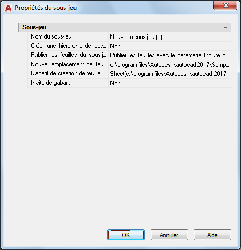 Indique le fichier gabarit de dessin (DWT) et le nom de la présentation utilisée pour créer des fichiers dessin pour ce sous-jeu.