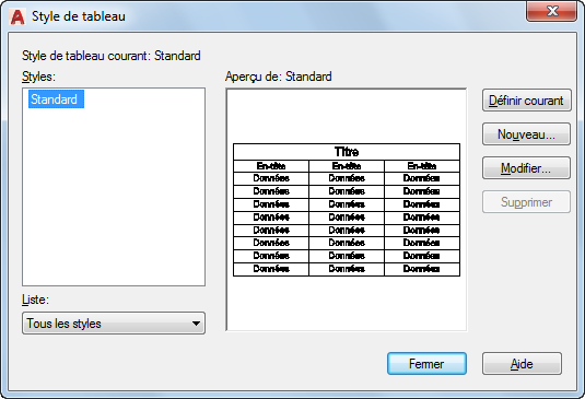 Supprime le style de tableau sélectionné dans la liste Styles. Vous ne pouvez pas supprimer le style en cours d'utilisation dans le dessin.