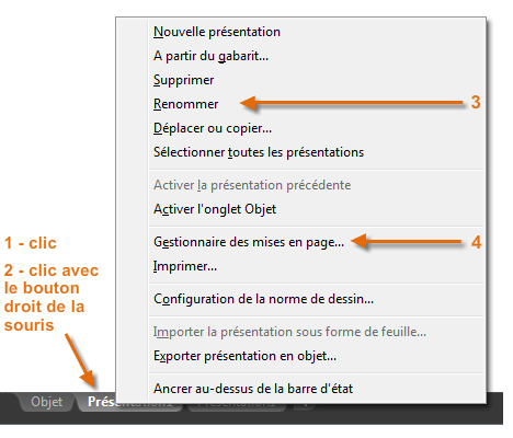 Lorsque vous accédez à un onglet de présentation (1), vous devez avant tout cliquer avec le bouton droit de la souris sur l'onglet (2) et le renommer (3) avec un nom plus spécifique que Présentation 1. Pour une présentation au format D, ARCH D ou ANSI D peuvent s'avérer des choix judicieux.