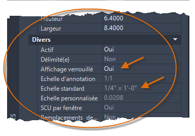 6. Dans la palette Propriétés, vous pouvez spécifier l'échelle standard 1/4" = 1'-0" dans la liste déroulante. Cette opération met à l'échelle précisément votre vue de l'espace objet en fonction du dessin au format D. Vous pouvez également redéfinir la propriété Affichage verrouillé de Non à Oui. Ce paramétrage évite toute modification involontaire de l'affichage de la vue.