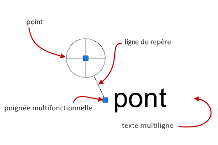 Un marqueur de position comporte un point, une ligne de repère et du texte multiligne. Vous pouvez utiliser les poignées multifonctionnelles pour modifier la longueur de la ligne de repère ou modifier le positionnement du texte multiligne.