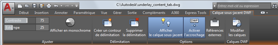 Onglet contextuel du ruban Calque sous-jacent DWF