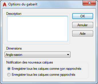 La boîte de dialogue Options du gabarit s'affiche automatiquement après avoir indiqué *.dwt comme type de fichier. Entrez le nom de fichier du gabarit, puis cliquez sur Enregistrer.